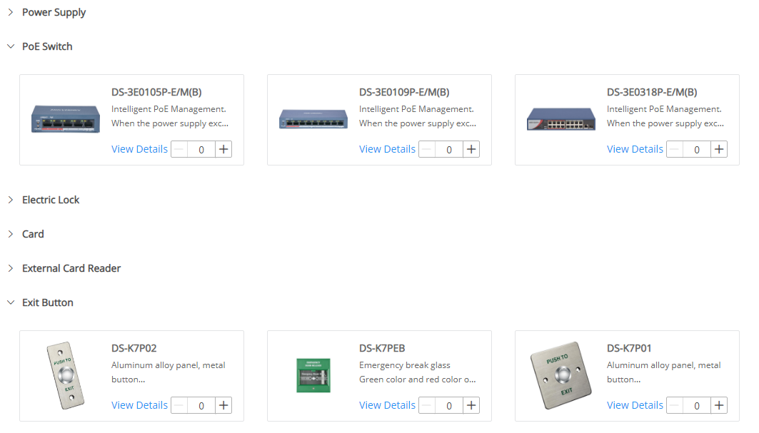 Accesoriile care pot fi selectate in acest pas includ surse de alimentare, switch-uri PoE, distribuitoare, inchizatoare electrice, carduri, cititoare de carduri si butoane de exit. In functie de produsele alese anterior, selectarea anumitor accesorii sau combinatii de accesorii poate fi obligatorie pentru a trece la ultimul pas. Pentru inchizatoarele electrice, trebuie selectat suportul adecvat.