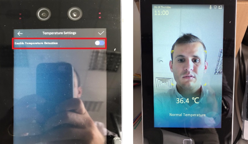 Terminalul poate fi utilizat ca echipament de screening de temperatura prin activarea functiei Enable Temperature Detection. Persoanelor care intra in zona de actionare a echipamentului li se va masura temperatura, informatie afisata pe ecranul terminalului si semnalata printru semnal vocal.