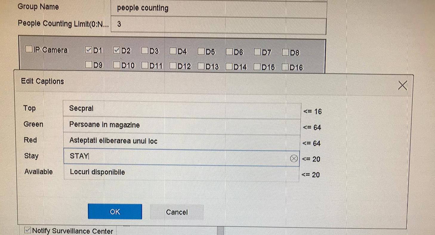 Functia Enable Local Display va afisa pe imaginile live a camerei numarul de persoane care au patruns in perimetru.