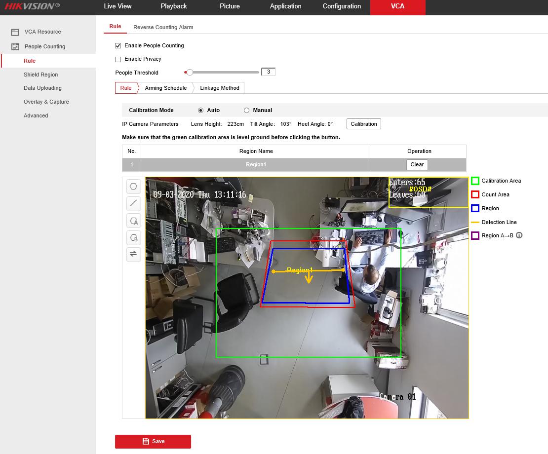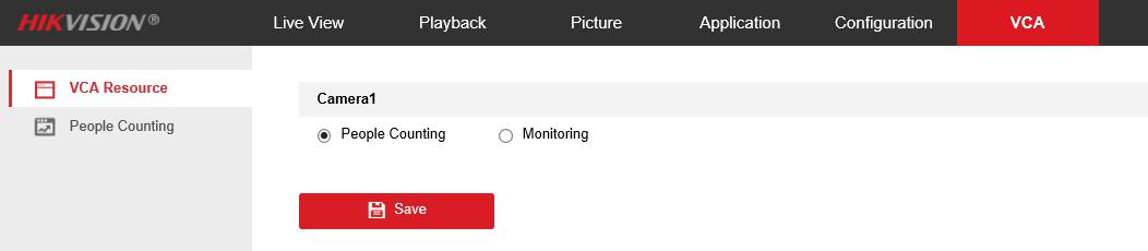 Din interfata web a camerei se va naviga in meniul VCA->VCA Resource si se va activa functia People Counting.