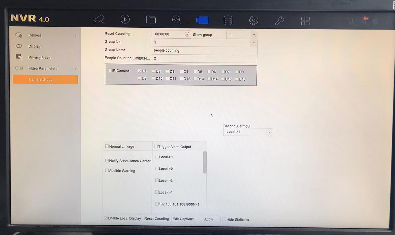 Se navigheaza in interfata locala a NVR-ului, meniu Camera->Camera Group, de unde se defineste 1 grup compus din camera IP de contorizare persoane inrolata pe canalul D1. Modelul DS-7716NI-I4 suporta 16 grupuri de camere IP. O camera IP poate sa faca parte din mai multe grupuri.