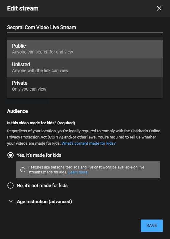 Live-ul de pe YouTube poate fi public (orice persoana poate accesa si vizualiza clipul), unlisted (doar persoanele care primesc link-ul au acces la imagini) sau privat (disponibil doar pentru titularul contului de YouTube).