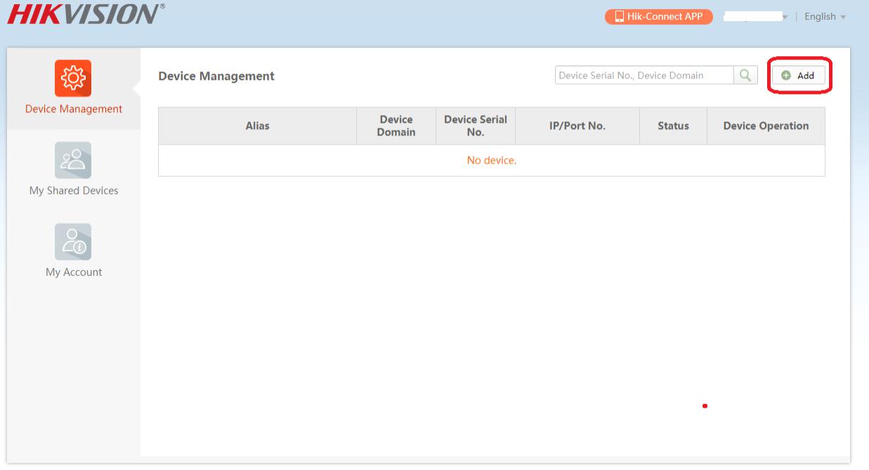 Dupa autentificarea cu succes in contul Hik-Connect, se va efectua un click pe butonul Add.