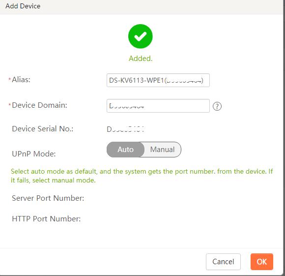 Un sumar al inrolarii va fi afisat. Implicit setarile UpnP sunt pe auto. Exista posibilitatea fixarii de porturi prin care postul de exterior va comunica cu serverele HikConnect si cu aplicatia mobila. Un avantaj al setarii manuale consta in accesul la setarile de parametri de la distanta, via iVMS4200/HikConnect. Setarile sunt incheiate prin apasarea butonului OK.