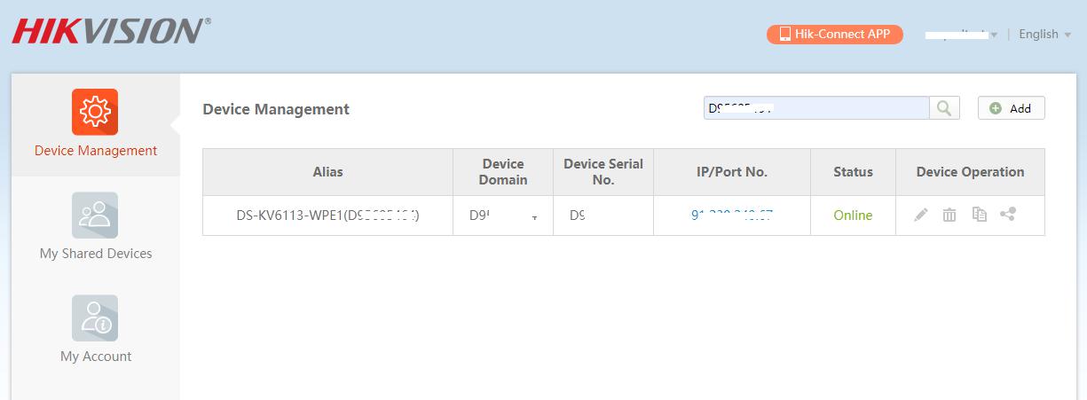 In campul Device Serial No se va completa cu serialul produsului apoi click Search. Avand serviciul online de Hik-Conect, la apasarea butonului Search, platfoma ne va returna codul postului de exterior. Click pe simbolul + pentru a avansa in etapa de inrolare.