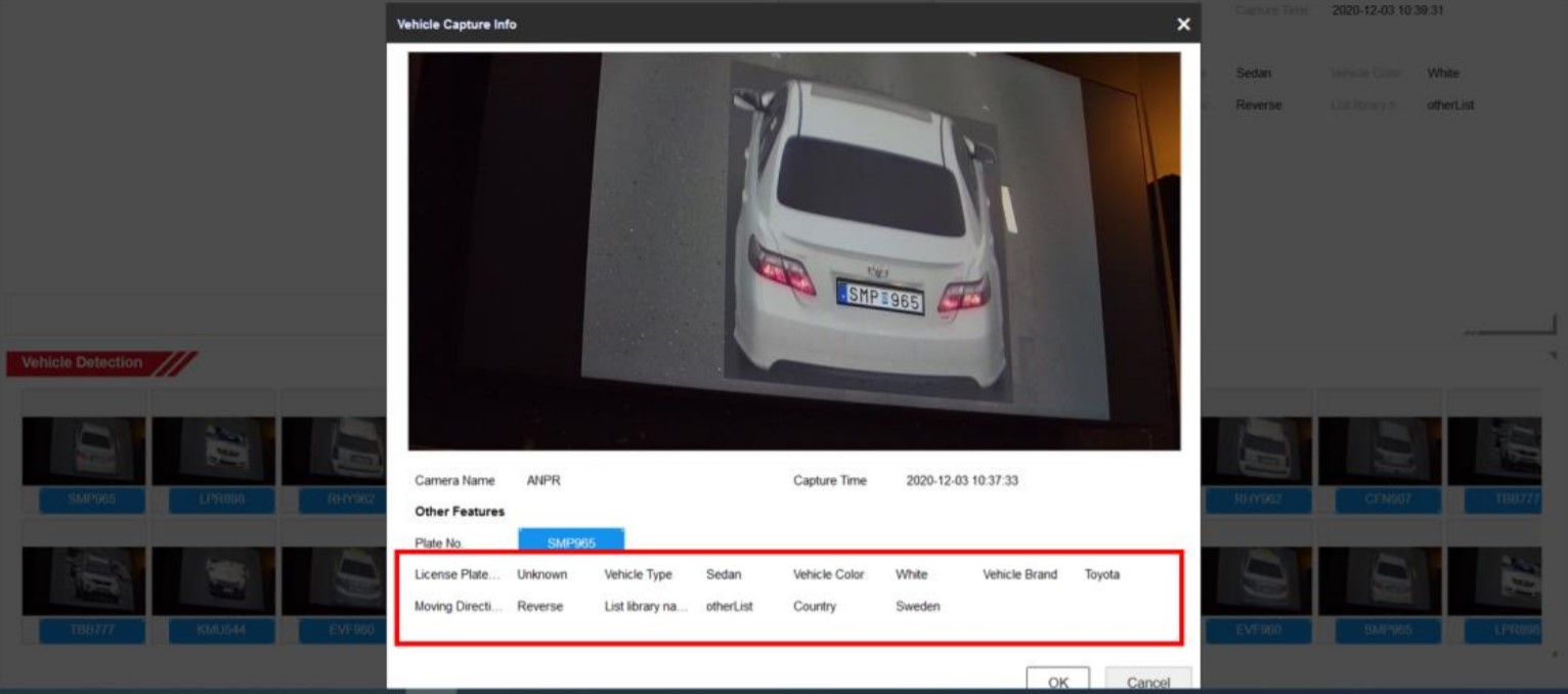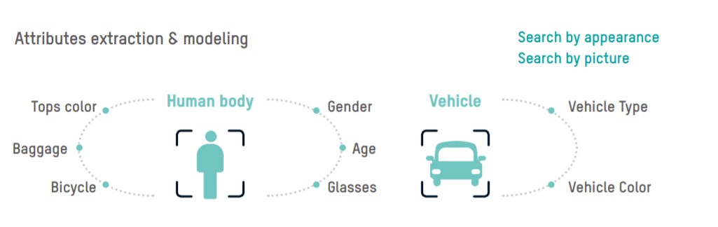 In cazul detectiei de vehicule, camerele pot recunoaste diferite atribute ale acestora, printre care culoare, tip, brand, directia de deplasare, tara. Informatiile capturate sunt asociate cu un snapshot al vehiculului in cauza. Evident, operatorii pot aplica filtre de cautare ca brand sau culoare in vederea restrangerii listei de cautare.