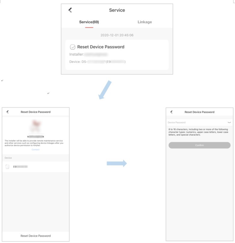 2. Resetare parola dispozitiv. Aceasta metoda de recuperare functioneaza doar daca sistemul este monitorizat prin intermediul paltformei Hik ProConnect. In caz afirmativ, utilizatorul poate reseta parola doar cu ajutorul unui cont de installer (definit in Hik ProConnect). Installer-ul trebuie sa fie logat in aplicatia HikConnect si in aceeasi retea cu dispozitivul pentru care utilizatorul final doreste recuperarea parolei. Instalatorul trimite cererea de recuperare a parolei catre contul beneficiarului. Acesta primeste acest mesaj in HikConnect de unde va putea sa isi defineasca o noua parola.