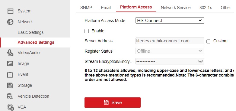 Din interfata web se poate activa navigand in Network->Advanced Settings->Enable. Dispozitivul va cere definirea unei parole de criptare pentru fluxurile video. Aceasta parola se va utiliza sau, mai bine spus, va fi solicitata utilizatorului la conectarea pentru prima oara la dispozitiv, fie prin intermediul aplicatiei mobile, fie via iVMS-4200.