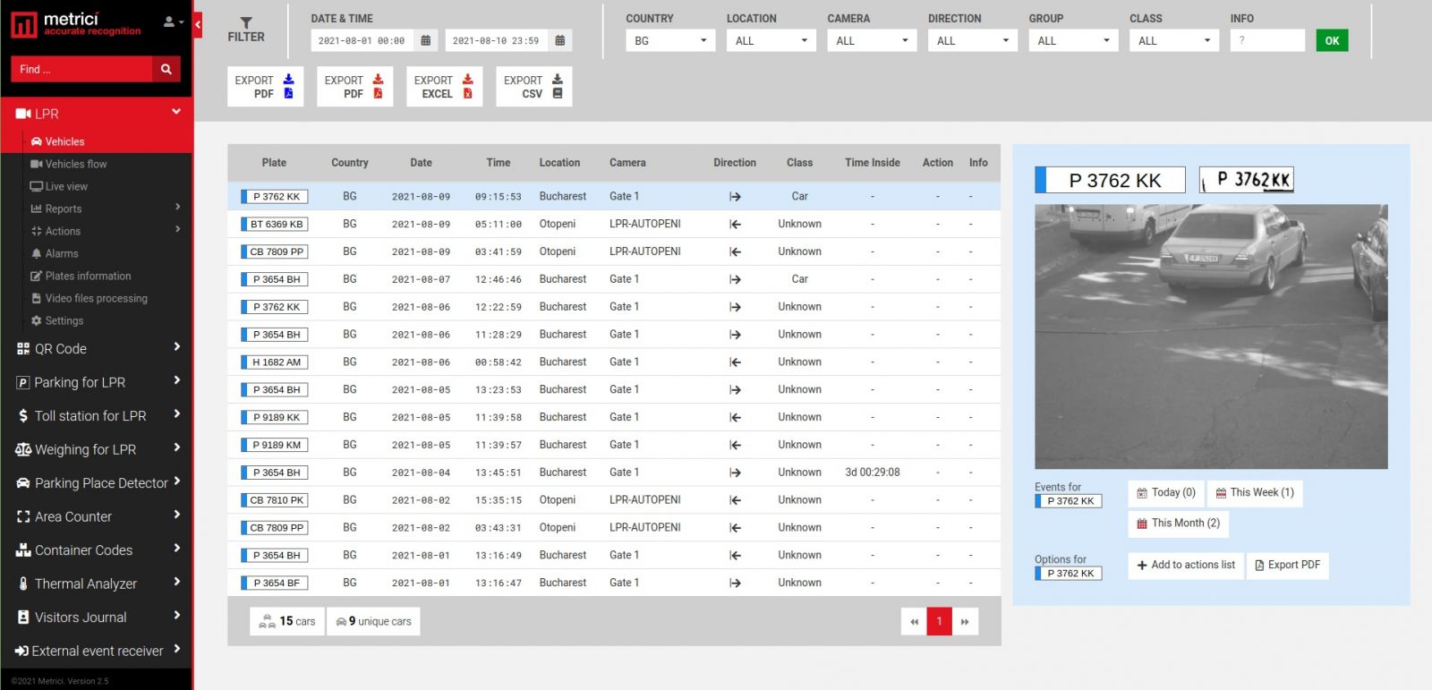 Metrici realizeaza o scanare a fisierelor video, iar datele sunt salvate in baza de date si accesibile in interfata. Toate obisnuitele informatii sunt salvate alaturi de numarul de inmatriculare: tipul de autovehicul, directia de miscare, ora detectiei, cu mentiunea ca este ora detectiei de pe serverul pe care s-a instalat licenta, nu ora cand s-a facut inregistrarea.