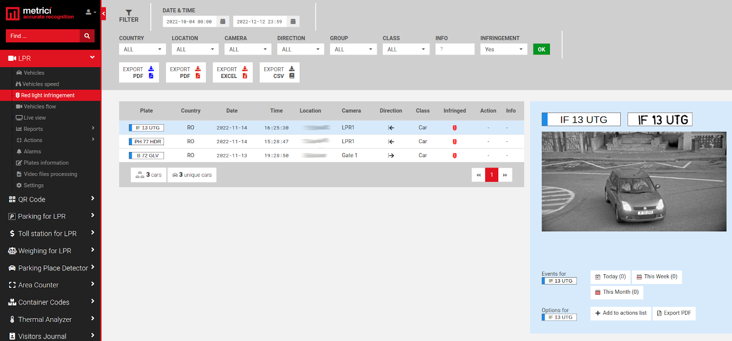In caz ca se va crea o fereastra de detectie dupa linia semaforului, iar un sofer nu respecta culoarea rosie, un eveniment va fi salvat in baza de date cu mentiunea speciala “red light infringement”, ce poate fi filtrata in Interfata. Doua fotografii-martor vor fi salavate impreuna si vizibile in Interfata: citirea LPR, precum si imaginea de pe camera companion, cu culoarea rosie a semaforului si vehiculul detectat. De asemenea, viteza are si ea o coloana dedicata in meniul de Interfata. Toate vitezele inregistrate de Metrici Observer Radar pot fi asocialte cu citirile LPR.