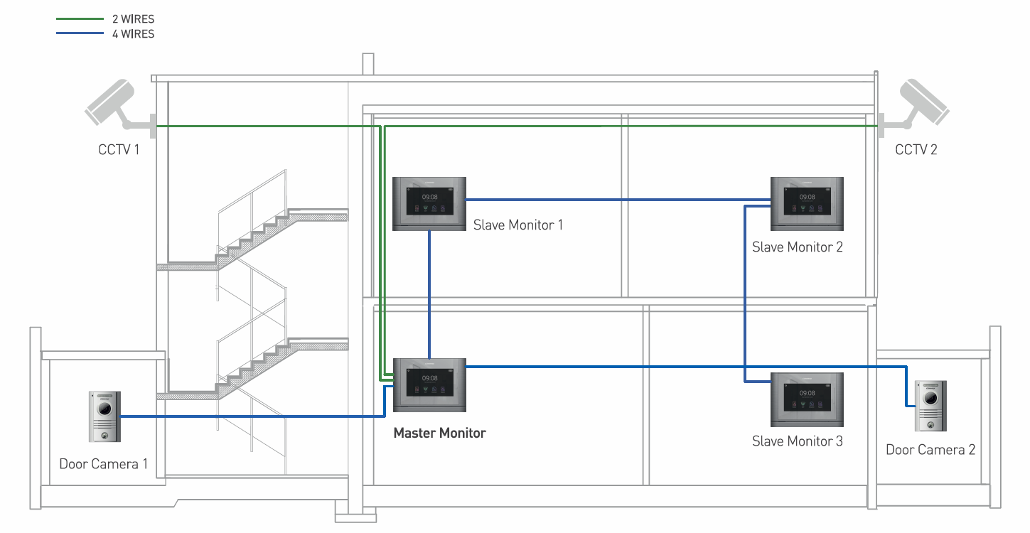 Cu alte cuvinte, un apel efectuat la oricare dintre cele două posturi de exterior ajunge la fiecare dintre cele 4 posturi de interior. Se depășește bariera tehnologică a produselor COMMAX conform căreia la un singur post de exterior video se pot conecta în paralel doar două posturi de interior.