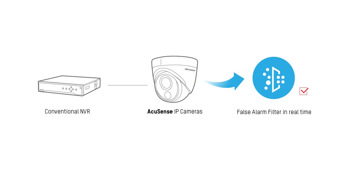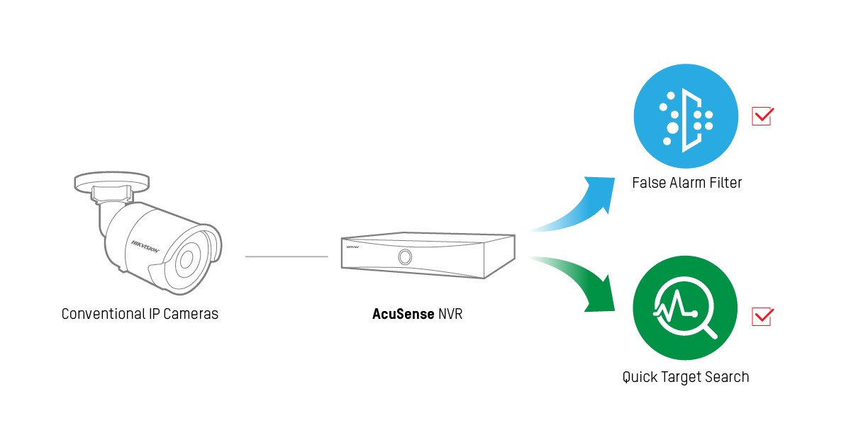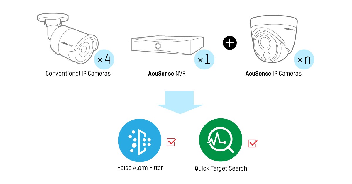 Faptul că NVR-urile și camerele IP AcuSense suportă filtrarea de alarme false permite adăugarea a mai mult de 4 camere în acest scop. De exemplu, NVR-urile AcuSense pot executa filtrarea de alarme false pentru 4 camere IP convenționale. La acestea se vor adăuga, dacă numărul de canale ale NVR-ului permite, camere IP AcuSense care la rândul lor vor elimina alarmele false. Atât filtrarea de alarme false cât și funcțiile de Quick Target Search vor fi disponibile pentru toate canalele NVR-ului.