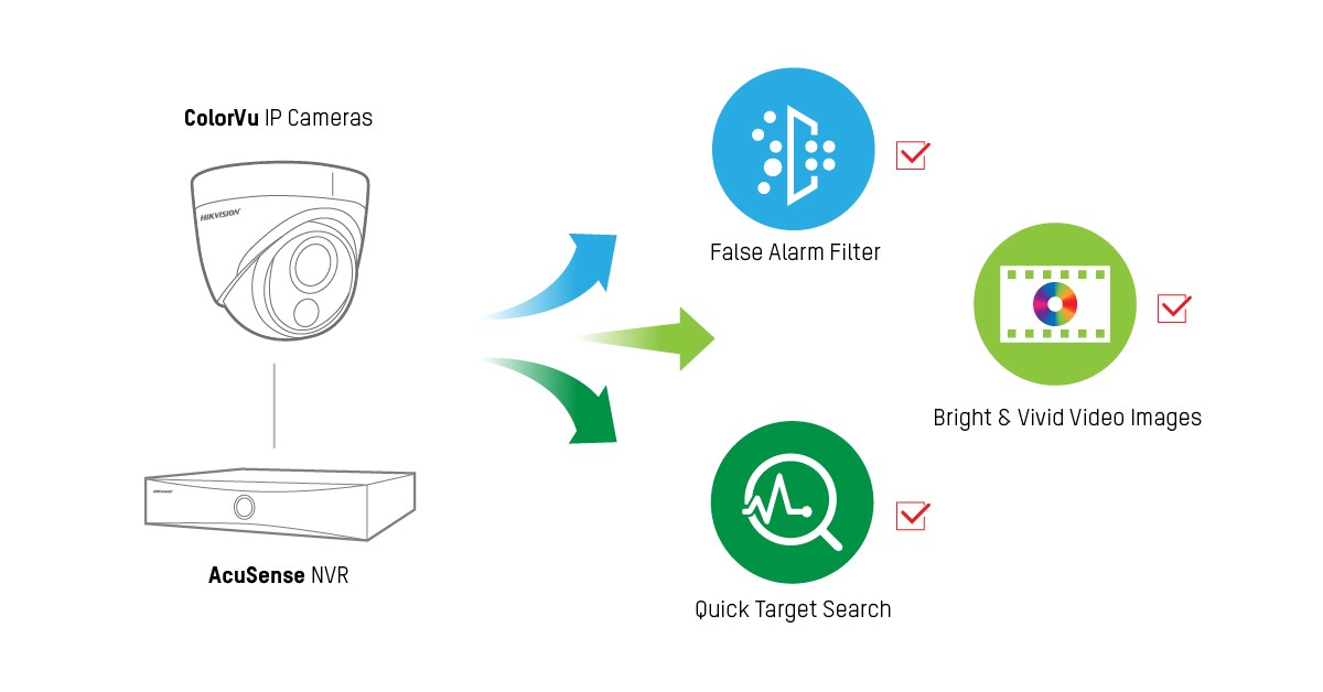 Alarmele false sunt filtrate cu o acuratețe de 90% din totalul de alarme. Funcția NVR-urilor AcuSense Quick Target Search economisește timp prin identificarea automata a secvențelor video în care sunt prezente persoane și mașini. Nu mai este nevoie de ore întregi de vizionat manual înregistrări în scopul indentificării unui eveniment. Adăugând camere Hikvision ColorVu, care sunt capabile de producerea unor imagini color chiar și pe timp de noapte, utilizatorii se pot bucura de avantajele filtrării alarmelor false indiferent de momentul din zi în care are loc evenimentul.