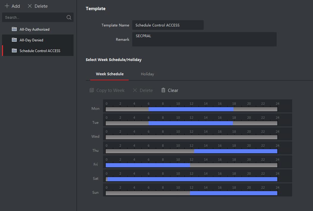 Programe personalizate de control al accesului. Acestea pot include zile ale săptămânii de lucru și sărbători legale.