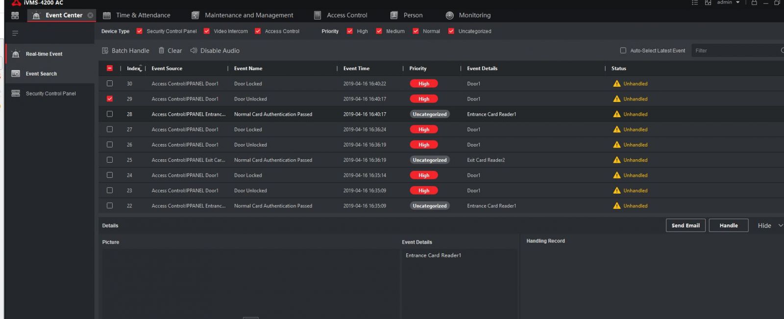 Centru de evenimente specifice sistemelor de efracție, interfonie și de control acces. Acestea pot fi afișate după prioritate (care poate fi definită în funcție de particularitățile fiecărui proiect cu etichete ca high, medium, normal, sau poate fi nedefinită, având eticheta uncategorized). Evenimentele din panoul de monitorizare evenimente în timp real au în mod implicit starea de unhandled. Aceasta poate fi schimbată prin introducerea unei observații a operatorului sub formă de text.