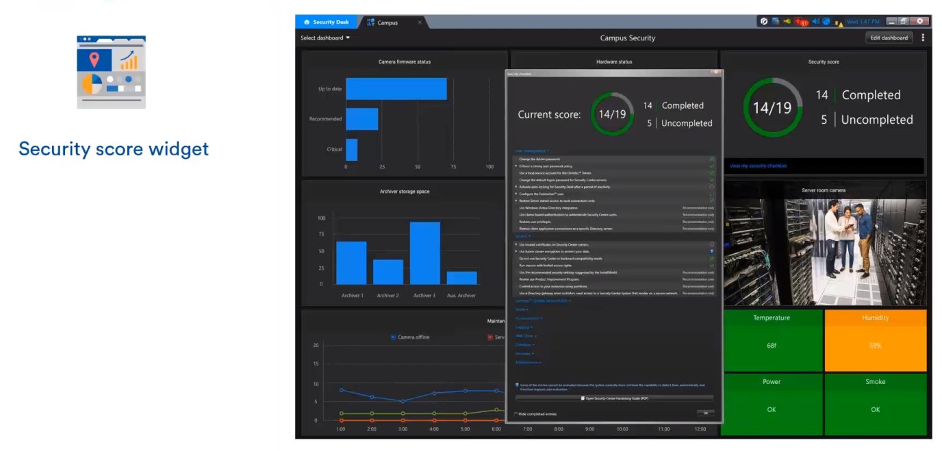 Aici intervine Genetec cu ajutorul noului widget Security Score. Începând cu versiunea 5.7 a Security Center, cei de la Genetec au pus la dispoziția administratorilor și a tuturor persoanelor de securitate un ghid, Hardening Guide, care reprezintă o listă cu acțiuni și criterii de bifat pentru sporirea securității și integrității unui sistem de securitate. Este o listă de recomandări care, dacă se aplică, sunt șanse destul de mari ca sistemul să facă față unor atacuri neautorizate sau, cel puțin, să întârzie orice încercare. Versiunea 5.8 a Security Center introduce noul widget de securitate. Acesta are la bază noua variantă a ghidului Hardening Guide și reprezintă un proces automatizat de securizare a sistemului și satisfacerea unei liste de recomandări venite din partea Genetec. O astfel de recomandare constă în definirea unei parole de utilizare de o dificultate ridicată, care să fie o combinație de litere mici, mari, cifre și caractere speciale. În funcție de numărul de criterii satisfăctute, widgetul va oferi un scor total al sistemului. Administratorii pot consulta acest widget în scopul bifării altor criterii și, implicit, al sporirii securității sistemului.