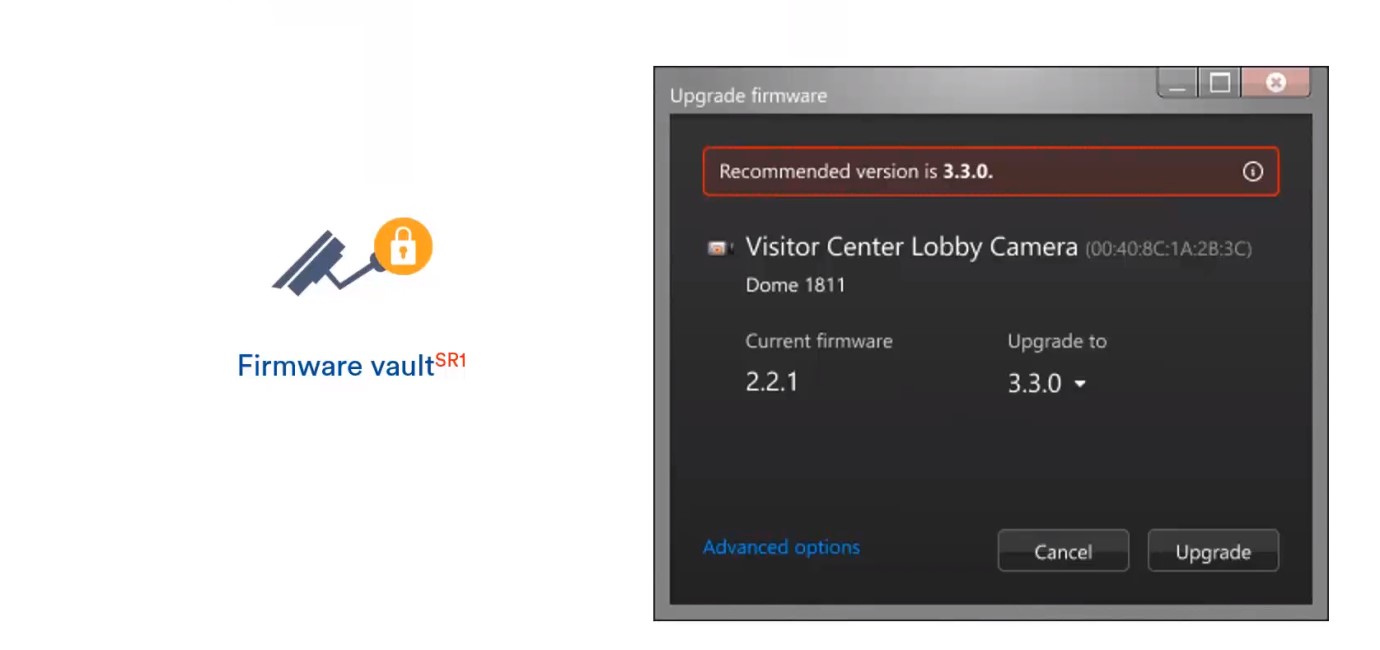 Un dashboard poate oferi informații referitoare la firmware-urile camerelor instalate în sistem, dacă acestea sunt actualizate la ultima versiune, pentru câte camere se recomandă actualizarea și alte informații. În acest scop, Genetec pune la dispoziția administratorilor un raport care se numește Firmware vault. Acest raport efectuează un audit al tuturor echipamentelor instalate în sistem și compară versiunile de firmware ale acestora cu o listă actualizată de firmware-uri. În funcție de indicațiile raportului, administatorii pot opta pentru descărcarea unei versiuni noi de firmware, dacă este disponibilă, și aplicarea acesteia în mod automat produselor selectate. Această procedură nu e complet automatizată deoarece necesită și un factor decizional prin intermediul administratorului care autorizează actualizarea de firmware.