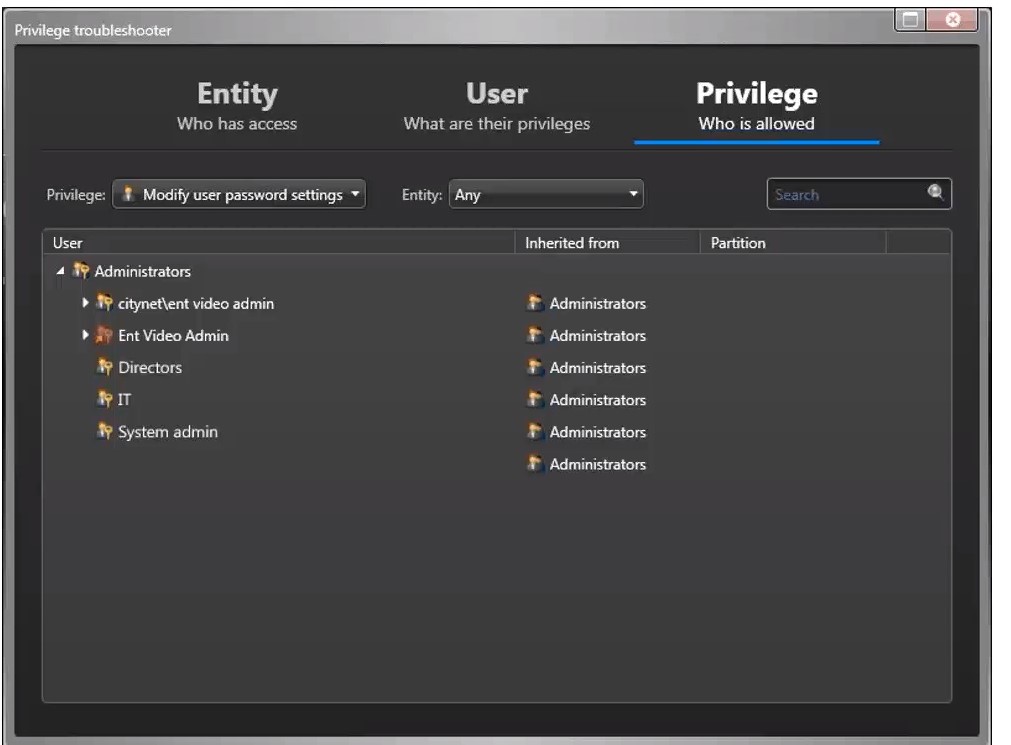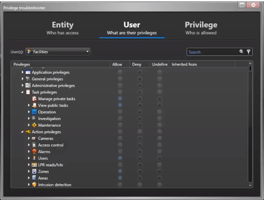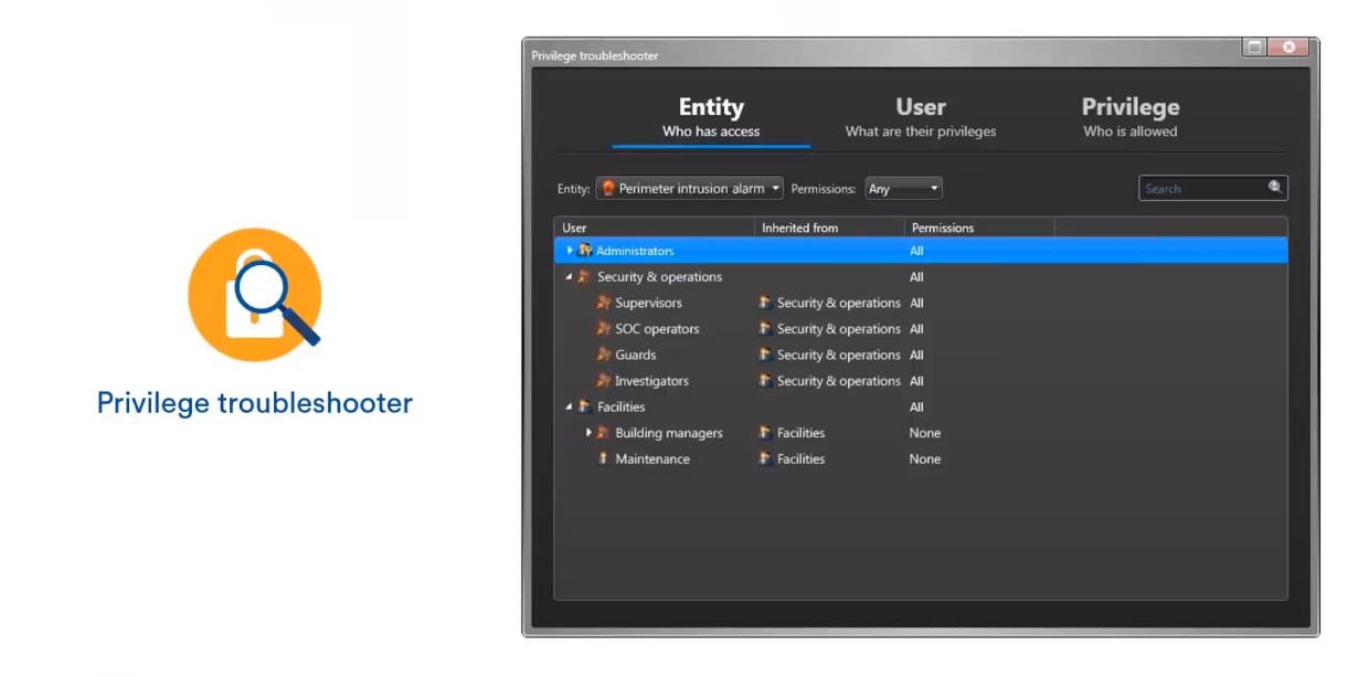 Adesea, administratorii de sistem creează utilizatori, grupuri de utilizatori cu drepturi temporare de access, control și vizualizare entități precum alarme, uși, camere etc. Șansele ca administratorii să revină la setările utilizatorilor și grupurilor de utilizatori sunt destul de reduse, iar un utilizator temporar poate activa ca unul permanent. Nicio problemă, deoarece versiunea 5.8 introduce așa numitul privilege troubleshooter, care efectuează un audit al tuturor utilizatorilor și al grupurilor de utilizatori din sistem asociați cu diferite drepturi de accesare și control. Putem vizualiza sub forma unei liste utilizatorii care pot recepționa o alarmă, care pot vizualiza o cameră de supravegehre etc.