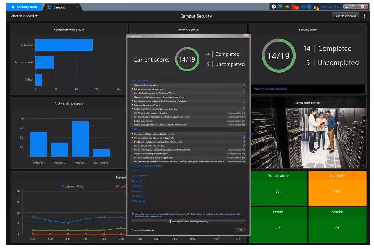Un dashboard Genetec permite operatorului accesul la o imagine de ansamblu a tuturor operațiunilor specifice sistemelor de securitate. Acesta oferă condițiile necesare analizei evoluției activității sistemului de securitate și suportul necesar în vederea luării deciziilor și acționării, totul pentru asigurarea stării de bine a întregului mecanism de securitate.