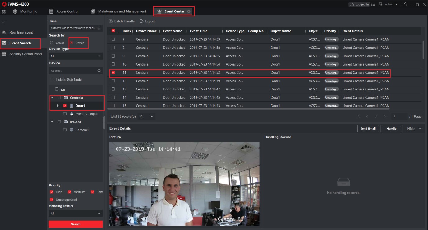 Exista posibilitatea urmaririi evenimentelor petrecute si stocate pe server prin navigarea in meniul Event Center->Event Search. Se va pune o bifa pe criteriul de cautare Device, apoi din lista arborescenta se va selecta usa pentru care se vor interoga evenimentele de control acces, iar in urma cautarii vor fi listate evenimentele generate de centrala respectiva.
