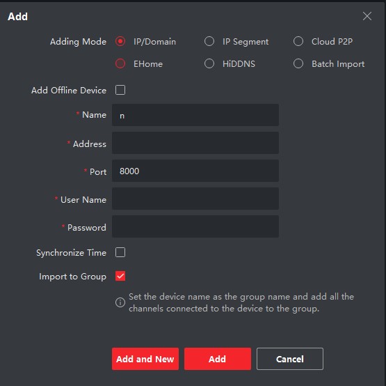 IVMS-4200 3.1.1.6 nu face distinctie intre tipurile de echipamente pe durata procesului de inrolare. Echipamentele pot fi inrolate din sectiunea Device Management prin click pe butonul Add si completand datele de conectare.