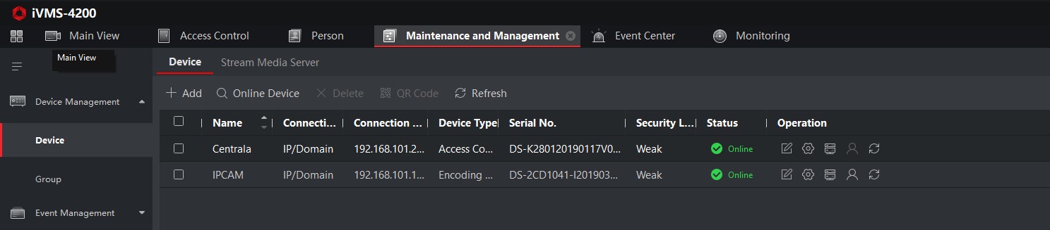 Daca datele introduse sunt corecte, atunci cele doua echipamente, camera IP si centrala de control acces DS-K2801, vor fi afisate in lista de echipamente sub statusul Online.