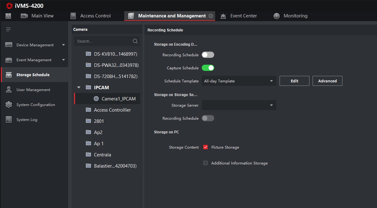 Exista posibilitatea definirii unui interval orar pentru care camera sa efectueze snapshoturi. Acesta poate, de exemplu, sa coincida cu programul de functionare de luni pana vineri cuprins intre 08:00 si 17:00. Pentru aceasta, se va naviga in meniul Maintenance and Management->Storage Schedule, se va selecta camera IP, se va activa functia Capture Schedule, se va defini un program personalizat, iar cea mai importanta optiune de activat este cea de Storage Content – Picture Storage.