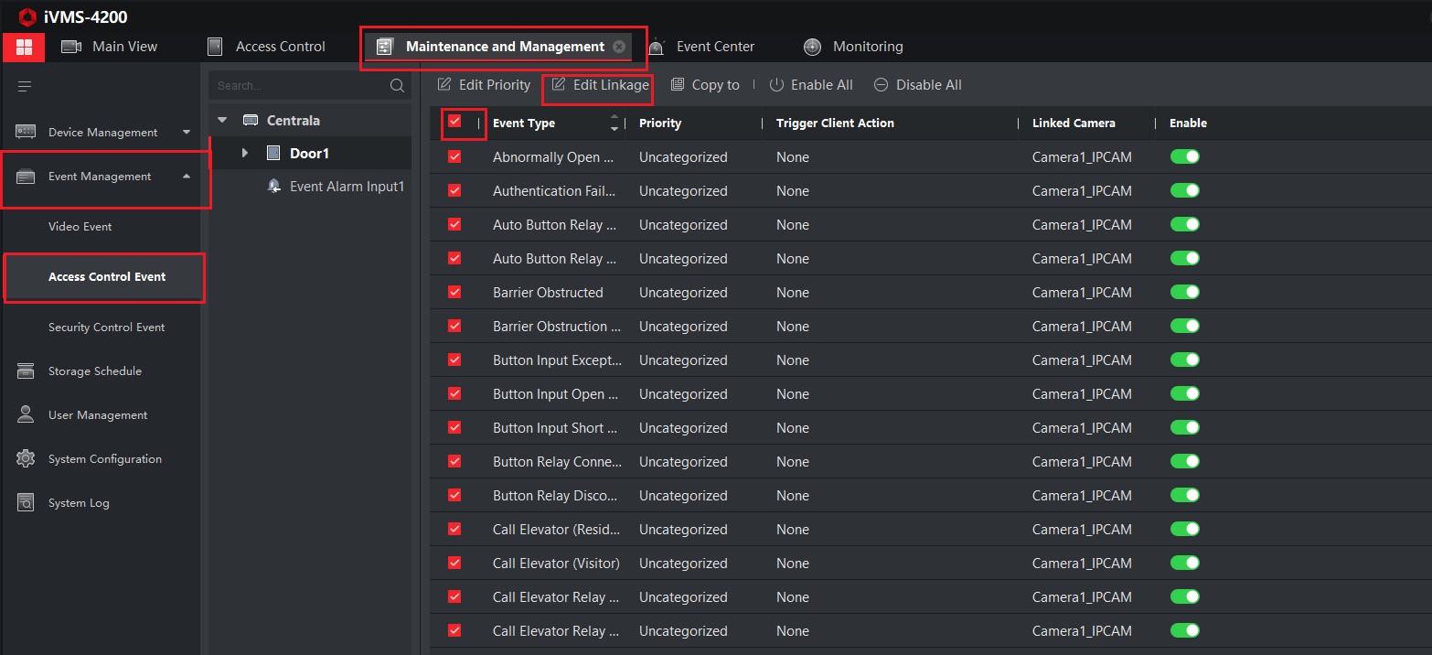 Pana in acest punct, fiecare echipament a fost tratat individual. Pentru crearea unei legaturi logice intre centrala si camera IP, se va naviga in meniul Maintenance and Management->Event Management->Access Control Event. Din lista cu echipamente de control acces se va selecta centrala in cauza.