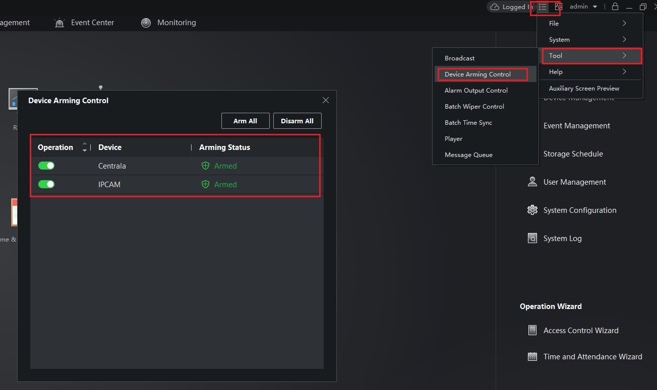 Pana in acest moment al configurarii am efectuat urmatoarele: inrolarea echipamentelor in software, definirea utilizatorilor si asignarea cardurilor de utilizare, activarea posibilitatii de salvare snapshoturi pe PC-ul local (unde este instalat IVMS-4200), crearea unui program de stocare, activarea evenimentelor pentru care se vor salva snapshoturile si crearea unei legaturi logice intre centrala si camera IP. Mai ramane ca sistemul sa fie armat. Pentru aceasta, se va naviga in Menu->Tool->Device Arming Control si se vor arma cele doua echipamente prin click pe butonul Arm All.