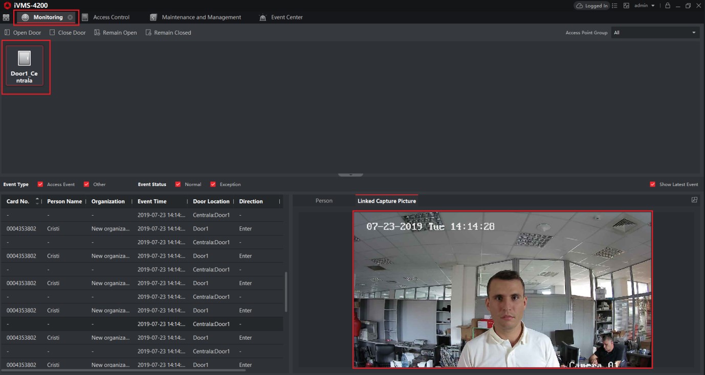 Monitorizarea in timp real a evenimentelor de control acces poate fi realizata prin navigarea in meniul Monitoring, de unde se va selecta usa de interes. Evenimentului de control acces ii este asociata o imagine provenita de la camera IP.