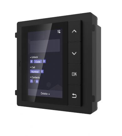 Familia de videointerfoane IP Hikvision generatia a 2-a se extinde odata cu lansarea noului display DS-KD-DIS. Afisajul de 3.5" cu tehnologia LED are o rezolutie de 320x240 pixeli si permite navigarea intr-o lista de maxim 2000 de contacte. Pentru navigare, sunt disponibile 4 butoane fizice iluminate. Vizitatorii pot cauta nume in lista de locatari in vederea apelarii sau pot deschide usa prin intermediul unui PIN.