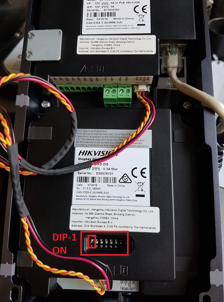 Urmatorul pas consta in asignarea adresei 1 pentru extensia DIS si conectarea la unitatea de baza prin intermediul cablului serial. Portul RS-485 OUT al DS-KD8003-IME1 va fi conectat la RS-485 IN al DS-KD-DIS.
