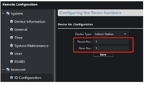 Se vor verifica datele de identificare ale postului de interior, cum ar fi Room no si Floor no din Device Management-> Device-> Se va selecta postul de interior-> Click pe butonul Settings (roata dintata)->Intercom->ID Configuration.