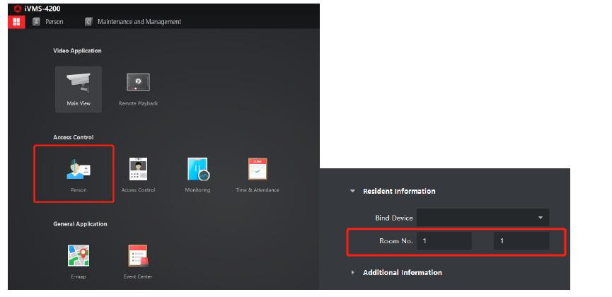 Pentru aceasta, se va naviga in meniul Person-> +Add->Se va completa numele locatarului, iar la resident information se vor introduce room no si floor no. Din Bind Device se va selecta unitatea de interior pentru care se va crea legatura logica intre persoana de adaugat si postul de interior.