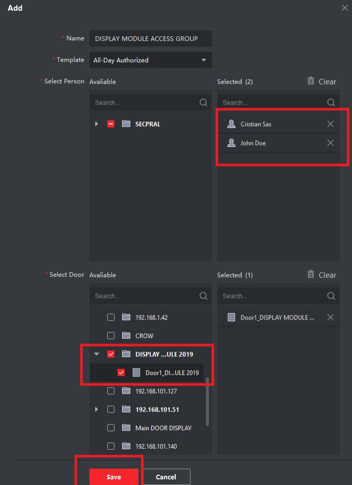 Se va naviga in Access Control->Access Group->Add. Se vor compleda detalii ca nume grup de acces, se vor selecta persoanele cu drepturi de acces (aceasta lista va fi vizibila si din DS-KD-DIS), se va selecta usa (postul de exterior la care este conectat modulul DS-KD-DIS) si Save.