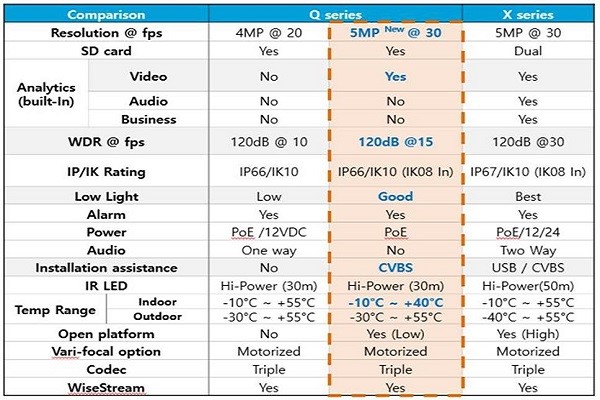 Gama de produse Wisenet Q ofera accesul la solutii simple cu functii esentiale in vederea securizarii unor scenarii de dimensiuni reduse si medii ca retail, sistem bancar sau birouri. Linia de camere de 5MP se alatura celor de rezolutie 2MP, respectiv 4MP, cu lentile fixe sau varifocale.