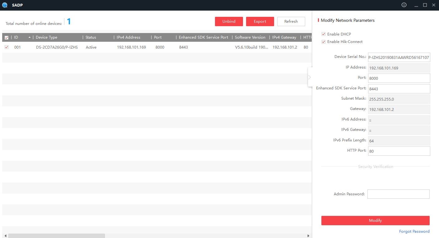 2. La rulare, aplicatia scaneaza reteaua si afiseaza echipamentele Hikvision online.