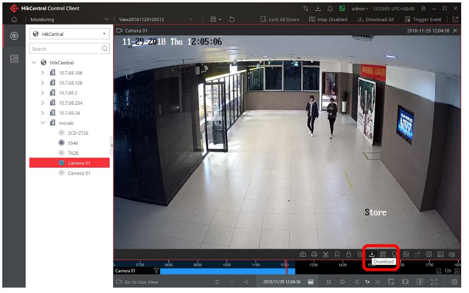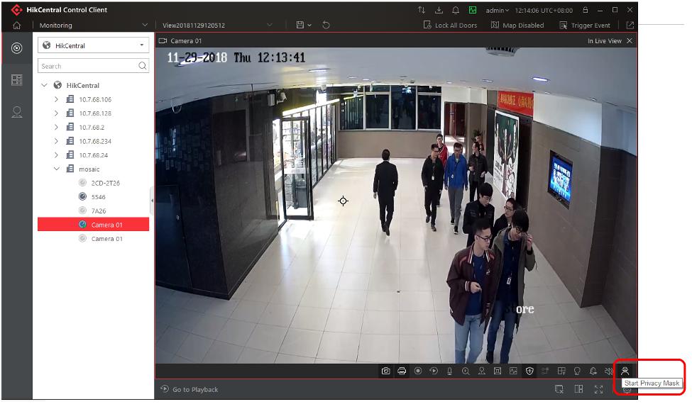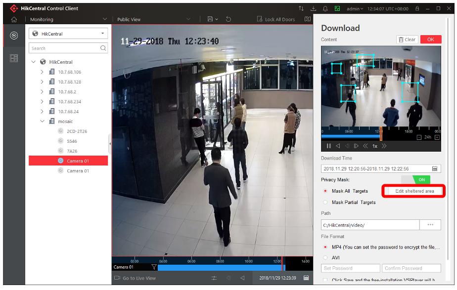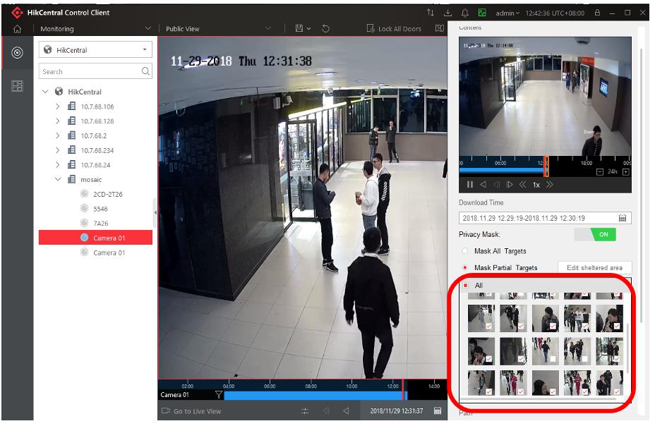 HIK-CENTRAL permite activarea mozaicului pentru modul de vizualizare live precum si descarcarea de inregistrari cu aceasta protectie activa.