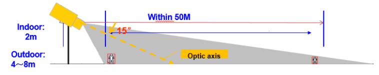 Distanta de monitorizare variaza in functie de distanta focala a lentilei. Astfel, pentru o lentila de 12mm, dinstanta maxima de monitorizare pentru care se obtin cele mai bune rezultate este de 50m, pentru 6mm la 40m, 8mm la 40m. Unghiul dintre axa optica a lentilei si planul orizontal sa depaseasca 15°.
