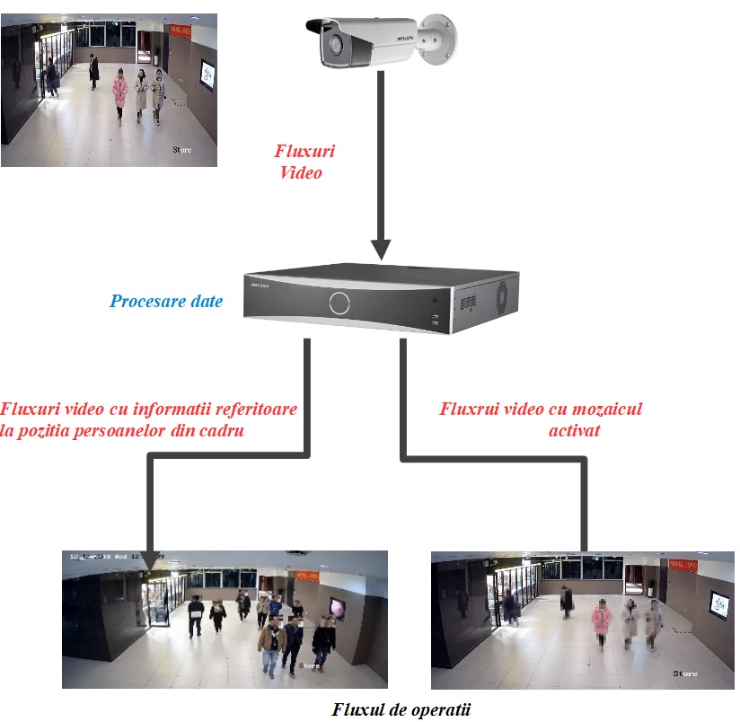 Principial, sistemul este capabil sa aplice un mozaic, care poate fi fix sau dinamic, pe persoanele care au patruns in campul vizual al camerelor. Fiecare NVR poate afisa live maxim 4 canale cu mozaic-ul activat, iar comutarea din modul live normal in modul de afisare mozaic este extrem de rapida. Daca intr-o scena pe langa suspect sunt mai multe persoane, atunci sistemul poate fi configurat astfel incat la salvarea inregistrarilor in vederea predarii acestora catre organele competente sa se aplice cate un mozaic pentru fiecare persoana, mai putin pe suspect. La aceasta se mai adauga posibilitatea exportului de inregistrari cu mozaic pentru absolut toate persoanele din scena.