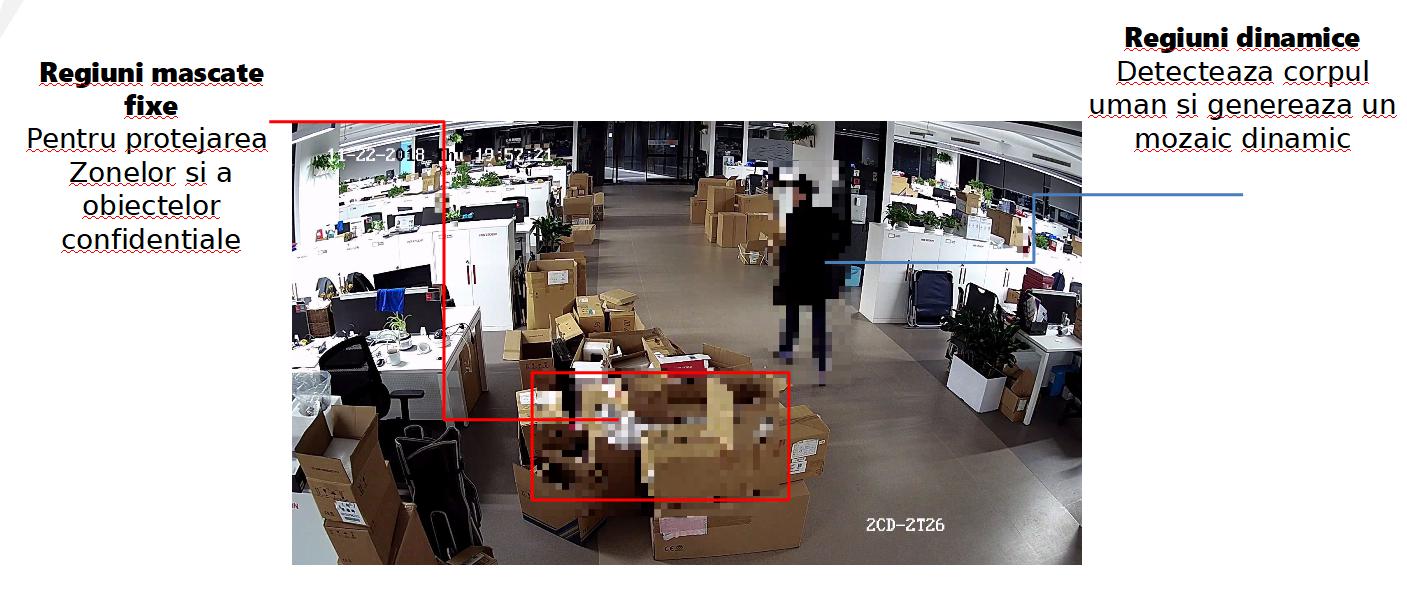 Tehnologia mozaicului permite definirea a 2 tipuri de regiuni de mascare: fixe si dinamice. Acestea sunt definite din interfata web a NVR-urilor in functie de topologia scenei. De regula, obiectele statice pot fi protejate din punctul de vedere al confidentialitatii cu regiuni fixe. Numarul de regiuni fixe care pot fi definite din NVR este egal cu numarul de canale al acestuia. In schimb, daca exista persoane in cadru, atunci se recomanda utilizarea de regiuni dinamice. Acestea urmaresc subiectul pe intreg traseul din campul vizual al camerei pentru care s-a activat mozaicul pentru regiuni dinamice. NVR-urile suporta maxim 4 canale cu regiuni dinamice indiferent de numarul total de canale suportate.