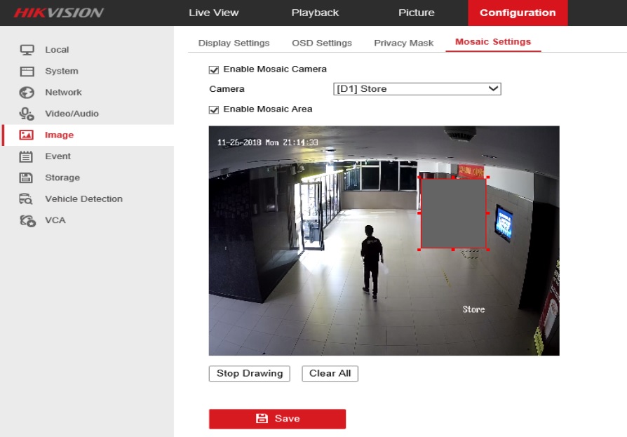 Mentionasem ca mozaicul poate fi definit din interfata web a NVR-urilor Deepinmind. Pentru aceasta, se navigheaza in meniul Configuration->Image->Mosaic Settings de unde se va activa functia mozaic pe camera selectata. Cu ajutorul mouse-ului se va trasa o zona de mascare de tipul regiune fixa, setarile sunt salvate prin apasarea butonului SAVE.