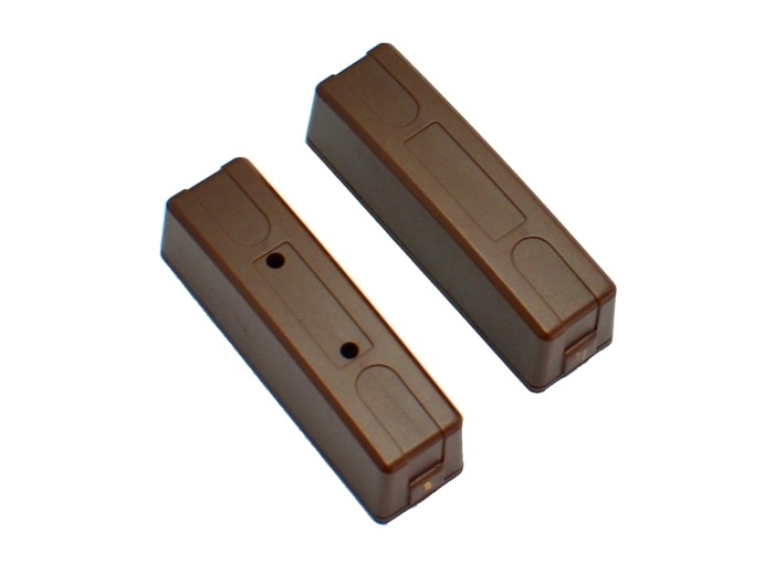 Contact montaj aparent din plastic maro, interspatiu 2.5 cm, contact NC, 0.5 A / 100 VDC, conexiune surub, posibilitate testare contact, dimensiuni 53×15.5×16 mm