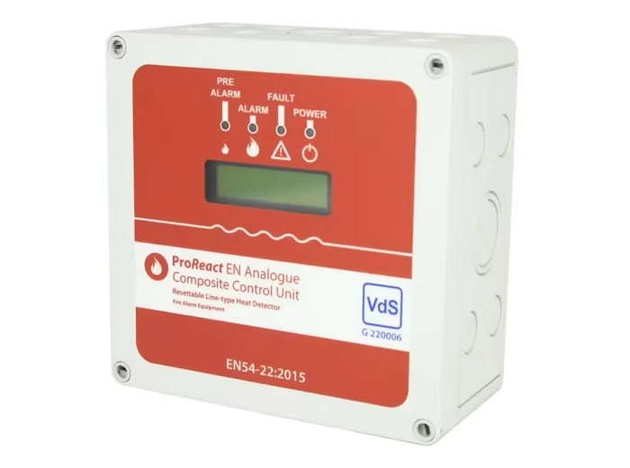 Unitate de control analoaga ProReact cu EOL inclus, certificare EN54, multiple variante de temperaturi nominale care sa genereze alarma - pot fi programate pe ecranul LCD al unitatii sau printr-o conexiune cu un laptop, posibilitate selectare temperaturi pre-alarma pentru a primi notificari din timp, iesire Mobus RS-485, functionalitate test incorporata, IP65 (IP08), dimensiuni 182 x 180 x 90 mm, greutate 860g