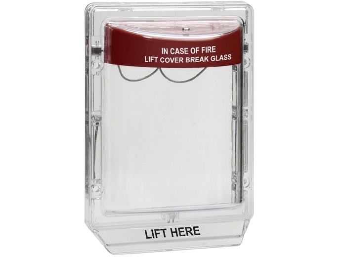 Carcasa de protectie pentru butoanele de incendiu de format mare (80490x), inscriptionare in limba engleza, formata dintr-un cadru si un capac din plastic policarbonat transparent, usor de instalat, clasa de protectie IP 44, dimensiuni 180 x 260 x 100 mm, masa cca. 590g, temperatura mediului -40 °C - 49 °C