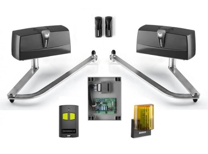 Kit pentru porti batante de maxim 2 x 3m, recomandat pentru porti cu stalp de sectiune mare, format din: doua motoare PR.45E, 2 brate articulate, controler HEADY cu receptor radio incorporat, 1 set fotocelule, o telecomanda, set elemente de fixare, lampa de semnalizare.