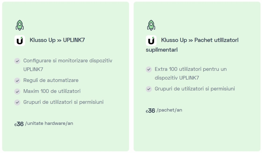 Dispozitivul poate fi controlat si programat prin aplicatia de mobil Klusso Up, disponibila in Apple App Store sau in Google Play Store. Pentru configurarea si adaugarea modulelor folositi acest link. Vezi toate abonamentele Klusso.
