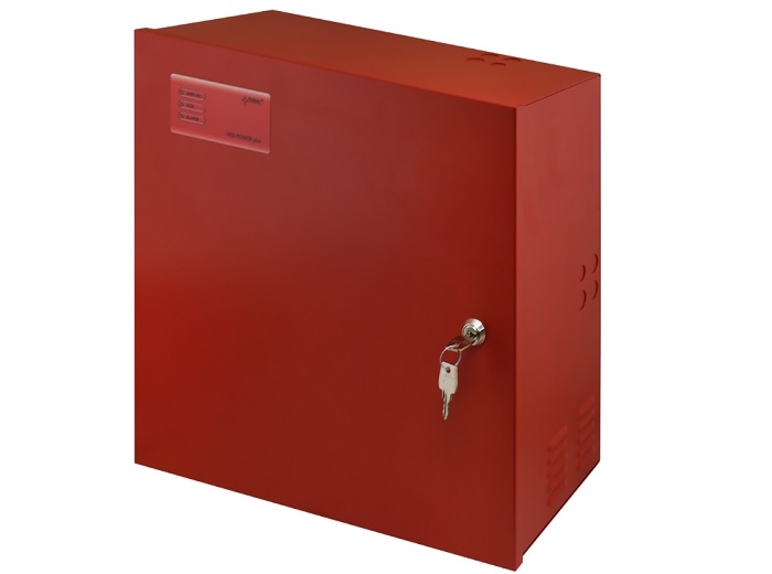 Sursa pentru sisteme de incendiu EN54C, 27.6V/10A, suporta backup acumulator 2 x 40Ah, in conformitate cu standardele EN 54-4 si EN 12101-10, 2 iesiri protejate independent AUX1 si AUX2, protectie impotriva scurt-circuitarii (SCP), supraincarcarii (OLP), supratensiunii (OVP), descarcarii electrice (UVP) si sabotajului - tamper, indicator LED, test baterie automat, proces de incarcare baterie in 2 etape, incarcare baterie accelerata, monitorizare continuitate circuit baterie, tensiune baterie, incarcare si mentenanta baterie, dimensiuni carcasa metalica rosie 425 x 411 x 178 mm