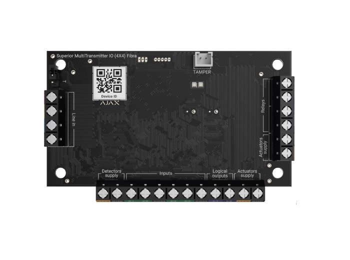 Modul interfata cablata (Fibra), gama Superior, Grade 3, cu 4 intrari si 4 iesiri pentru conectarea dispozitivelor third-party in sistemul Ajax, accepta tipurile de conectare NC, NO, EOL, 2EOL si 3EOL, comunicare cablata cu centrala max. 2000m, protectie impotriva scurtcircuitarii, alimentare 12-28 VDC (max. 330 mA la tensiune nominala de 24 VDC), dimensiuni placa 93 x 55 x 27 mm, greutate 44.9g.