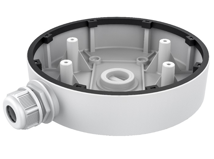 Cutie de jonctiune (doza de legatura) din aliaj de aluminiu pentru camere de interior sau de exterior Hikvision, are iesiri pentru cabluri, incarcare maxima 2kg, dimensiuni Φ155 mm x 36 mm, greutate 300g